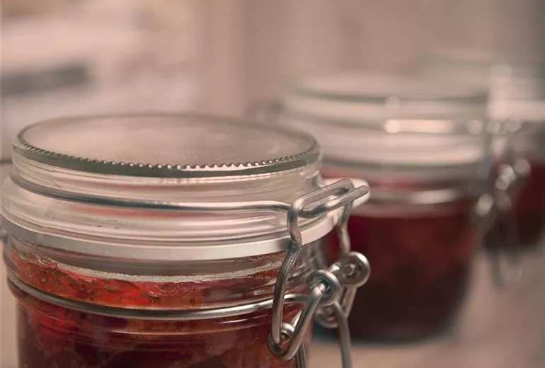 Zu den ersten Kandidaten im Jahr für eine Existenz im Marmeladenglas zählen die Erdbeeren. Später folgen weitere rote Beeren wie Johannisbeeren und Himbeeren. Auch andere Früchte der gleichen Farbe sind nicht zu vernachlässigen. Ob Sauer- oder Süßkirsche, diese wunderbare Erscheinung auf den entsprechenden Bäumen will man doch nicht komplett den Staren überlassen! Also heißt es ernten und in Brotaufstrich verwandeln. Ein Schildchen mit Inhalt und Herstellungsdatum auf die Vorderseite des Behälters, und ab in den Vorratskeller. Mit einem kleinen Stoffhäubchen hübsch verziert, eignen sich die Selfmade-Produkte auch bestens als Mitbringsel. Wieder einmal freuen sich vor allem diejenigen, die keinen Garten haben, über so viel naturnahe Nahrung. Denn Gartenerzeugnisse schlagen immer noch Marktangebote. Das funktioniert mit Mirabellen, Äpfeln, Birnen und den anderen Obstsorten genauso gut.