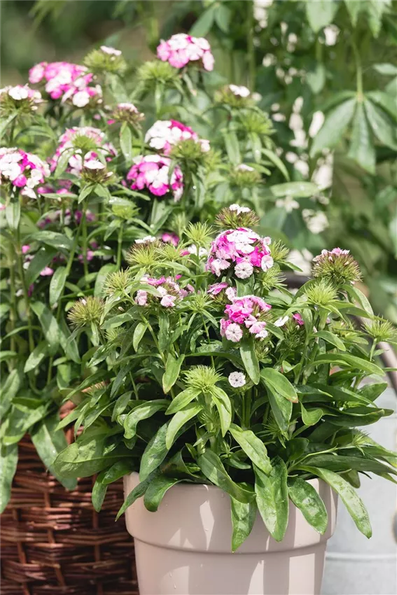Dianthus barbatus 'Dash' Die Bartnelke gehört zu den Nelkengewächsen, die ursprünglich aus Ostasien und Osteuropa stammen. Dort kommen sie als Wildpflanzen vor allem in den tieferen Regionen vor. Vereinzelt kann es aber auch vorkommen, dass die Nelkengewächse sich in den Höhenlagen ansiedeln. Die Nelkengewächse fühlen sich darüber hinaus aber auch an Felshängen sehr wohl. Von Ostasien und Osteuropa fand die Bartnelke dann ihren Weg in den heimischen Garten. Seitdem sind sie nicht mehr aus unseren Gärten wegzudenken.