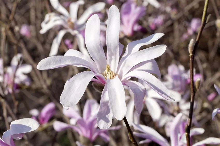 Magnolia x loebneri 'Merrill' Die Magnolie ist etwas ganz Besonderes. Sie kann sich vom kleinen Strauch bis zum großen Baum entwickeln und hat eine sehr lange Geschichte hinter sich. Die Magnolie gibt es seit mehr als 100 Millionen Jahren. Das macht sie zur ältesten Blühpflanze der Welt. Schon vor der Eiszeit war die Magnolie in Mitteleuropa heimisch. Bemerkenswert ist auch, dass sich aus der Magnolie alle anderen heute bekannten Laubgehölze entwickelt haben. Hierzulande sind Magnolien so beliebt, weil sie schon früh Farbe in den Garten bringen. Mit über 80 Arten ist für jeden Geschmack eine Magnolie dabei. Den Anfang macht die Stern-Magnolie an März mit ihren Blüten. Bis in den Sommer hinein blühen dann die unterschiedlichsten Magnolien.