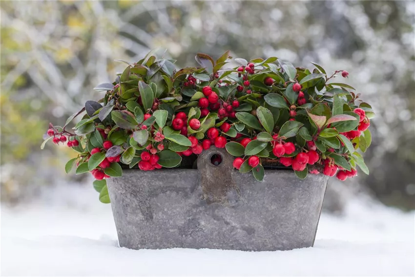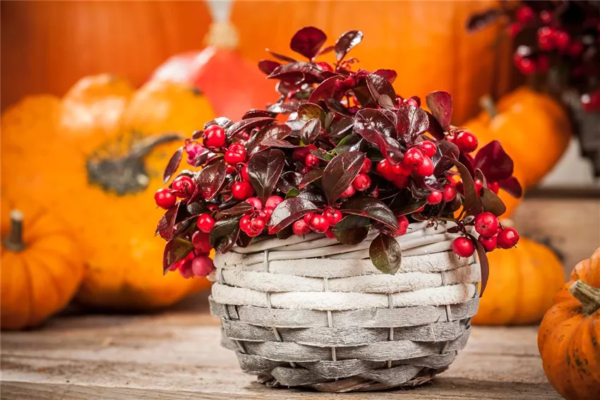 Gaultheria procumbens Es gibt Pflanzen, die sollte man lieber im Beet lassen. Bei der Scheinbeere ist das aber definitiv nicht der Fall! Klar, im Blumenbeet macht sie auch eine sehr gute Figur und sorgt für Farbtupfer im Garten, aber als Dekoration eignet sie sich auch hervorragend. Dafür muss man die Scheinbeere nicht mal schneiden oder aus ihrem Topf holen. Scheinbeeren passen perfekt in herbstliche und weihnachtliche Arrangements auf dem Esstisch, dem Wohnzimmertisch, dem Bücherregal, der Terrasse oder wo immer wie stimmungsvoll dekorieren wollen.